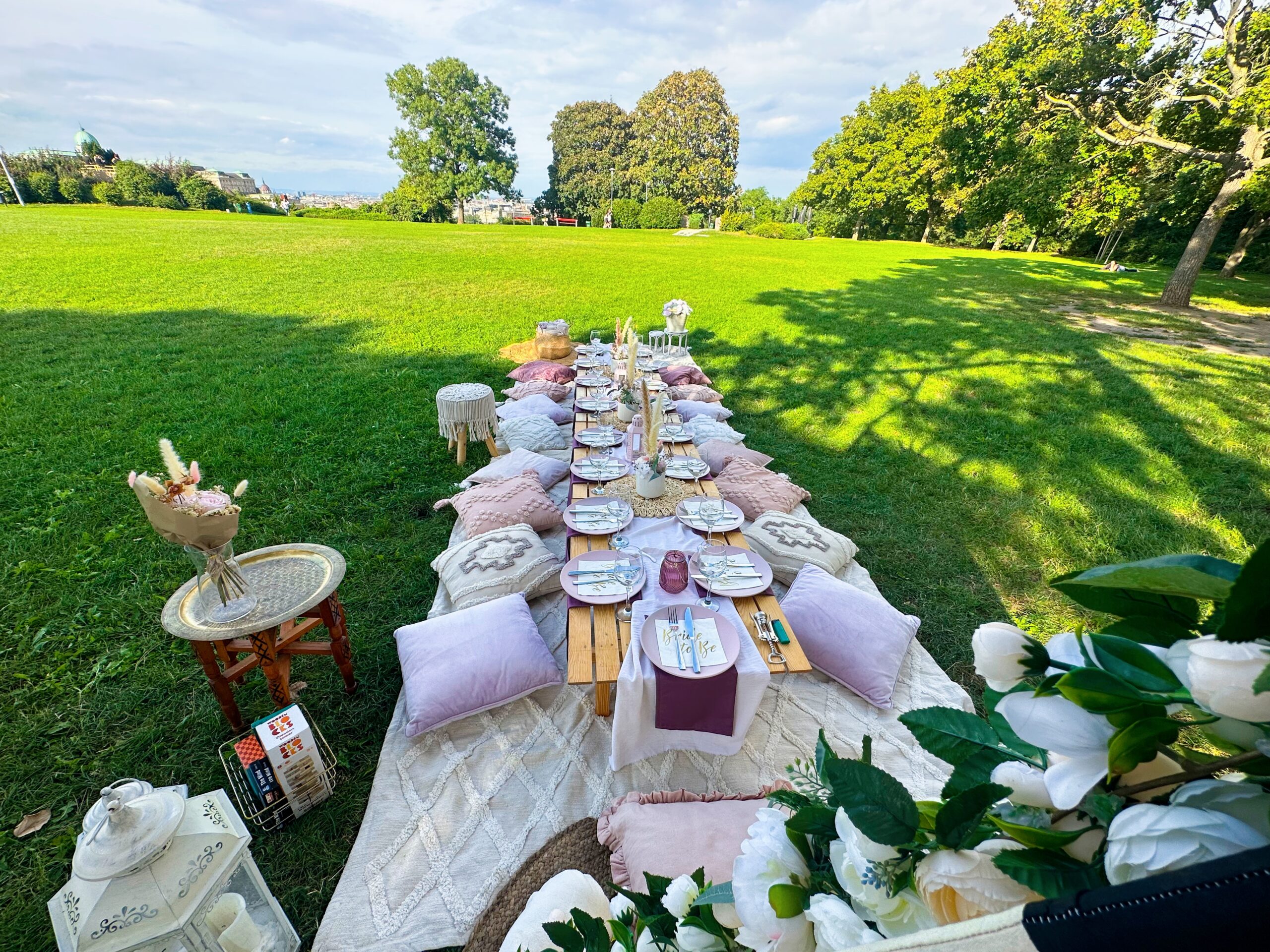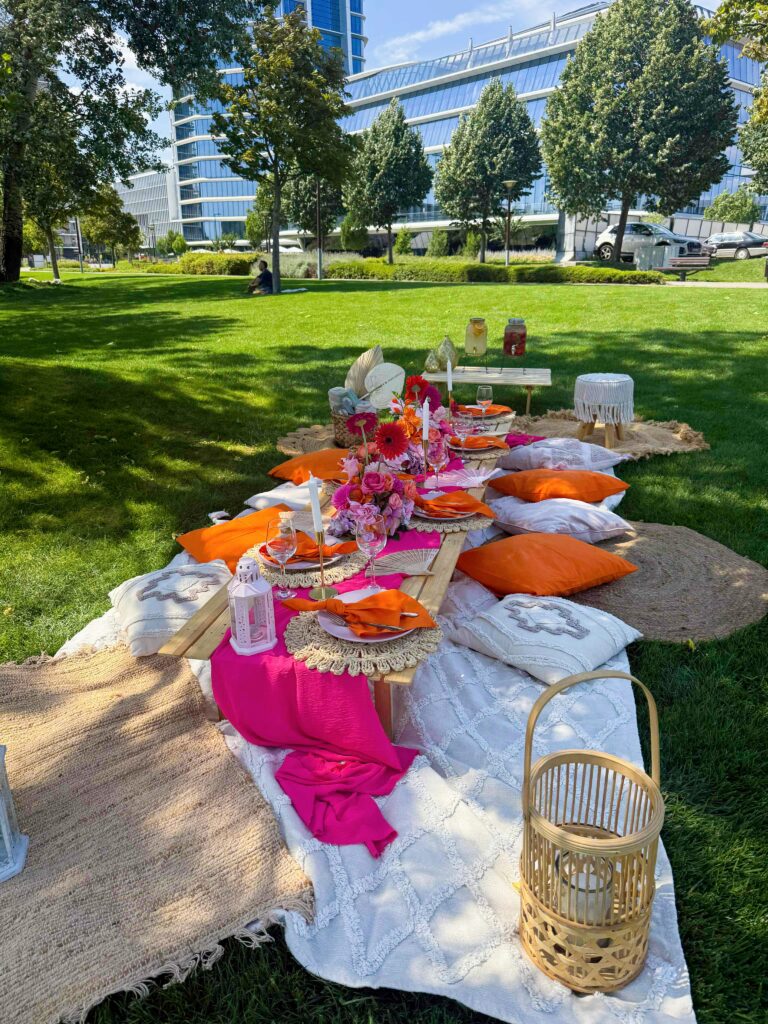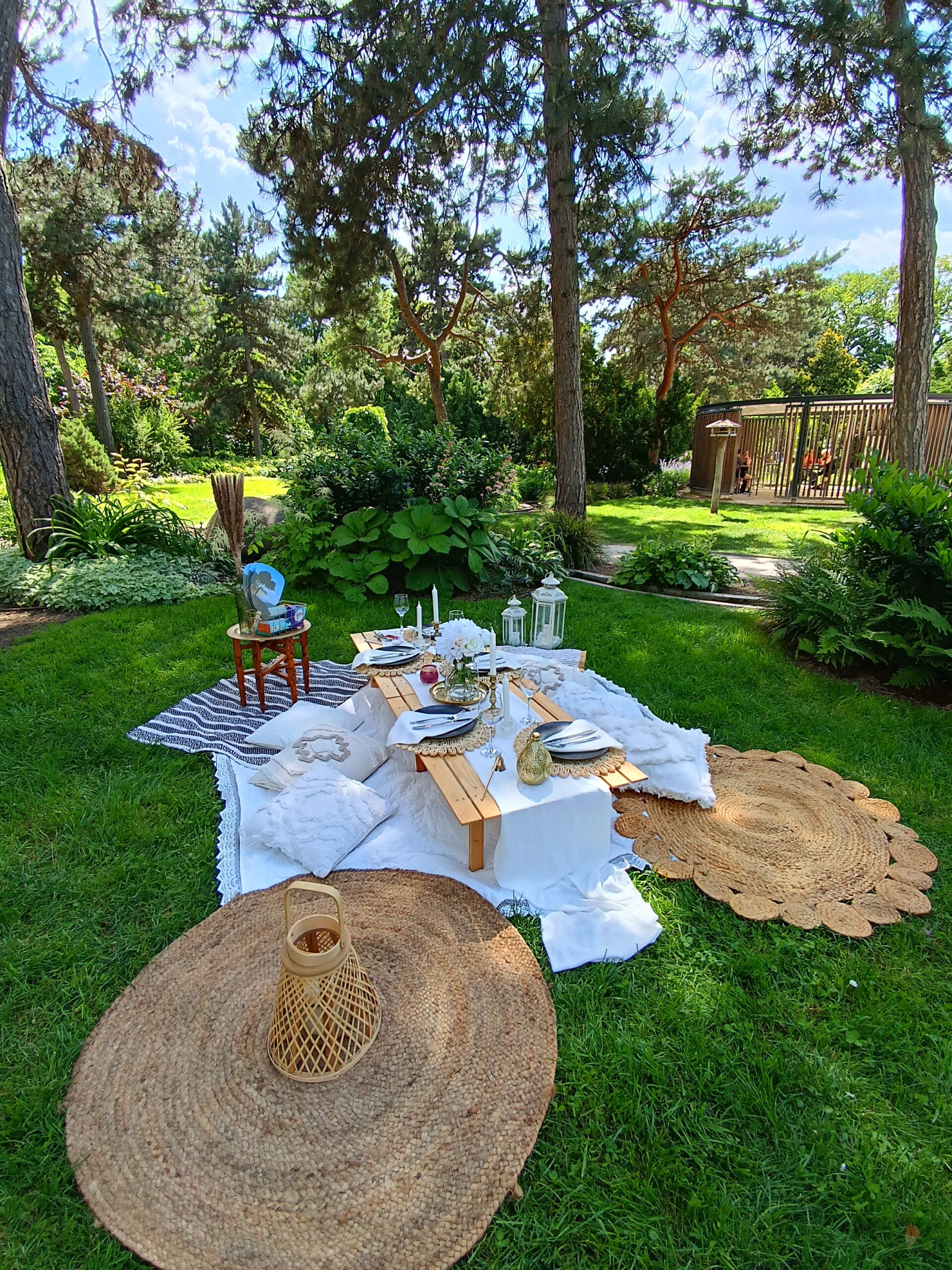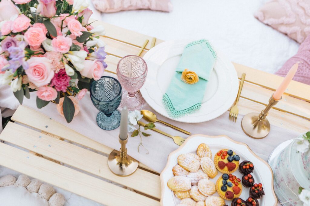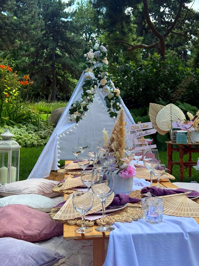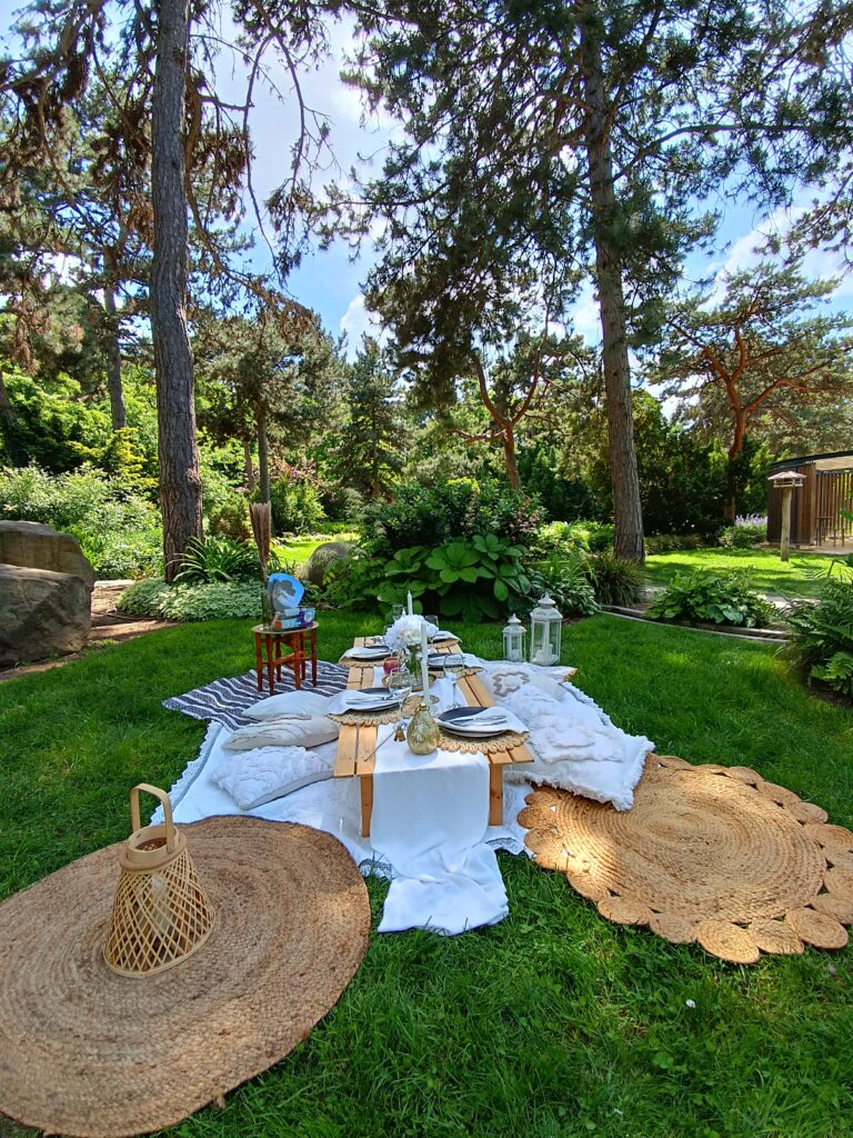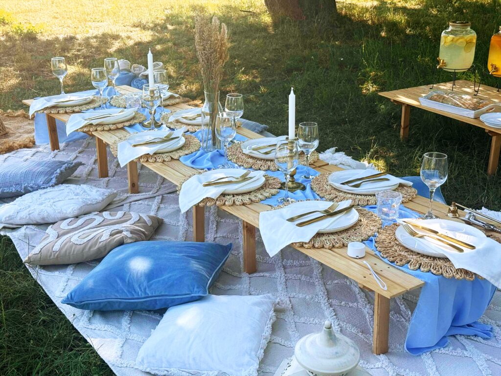 – piknikasztal terítékkel