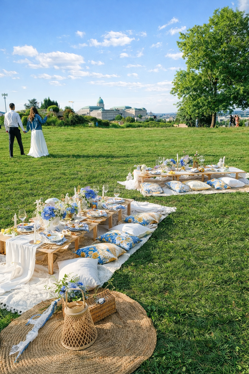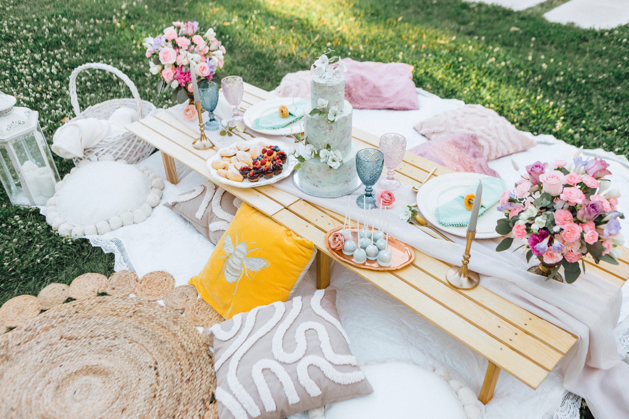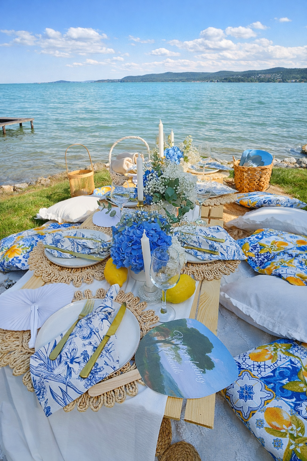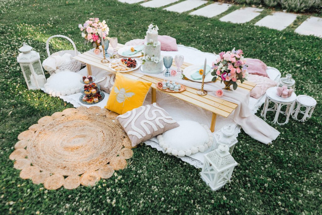 – piknikasztalok teljes terítékkel