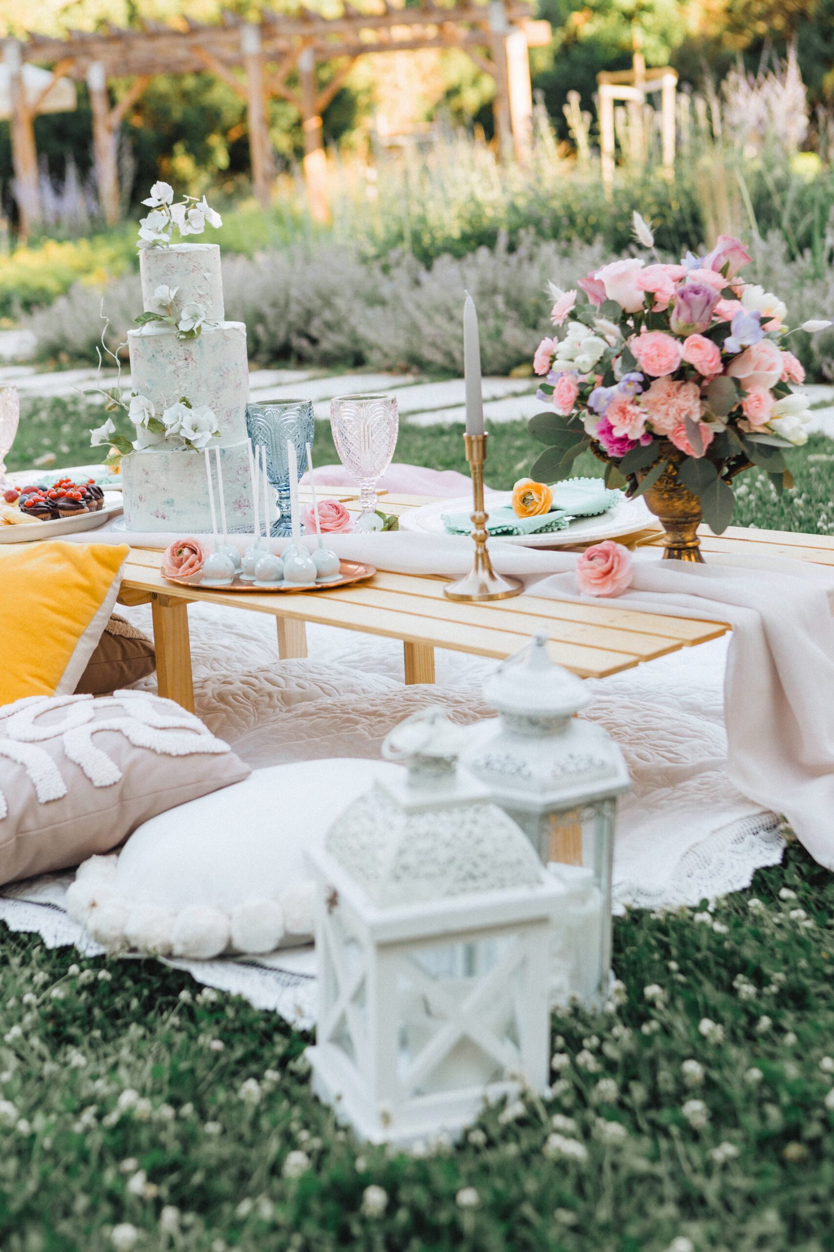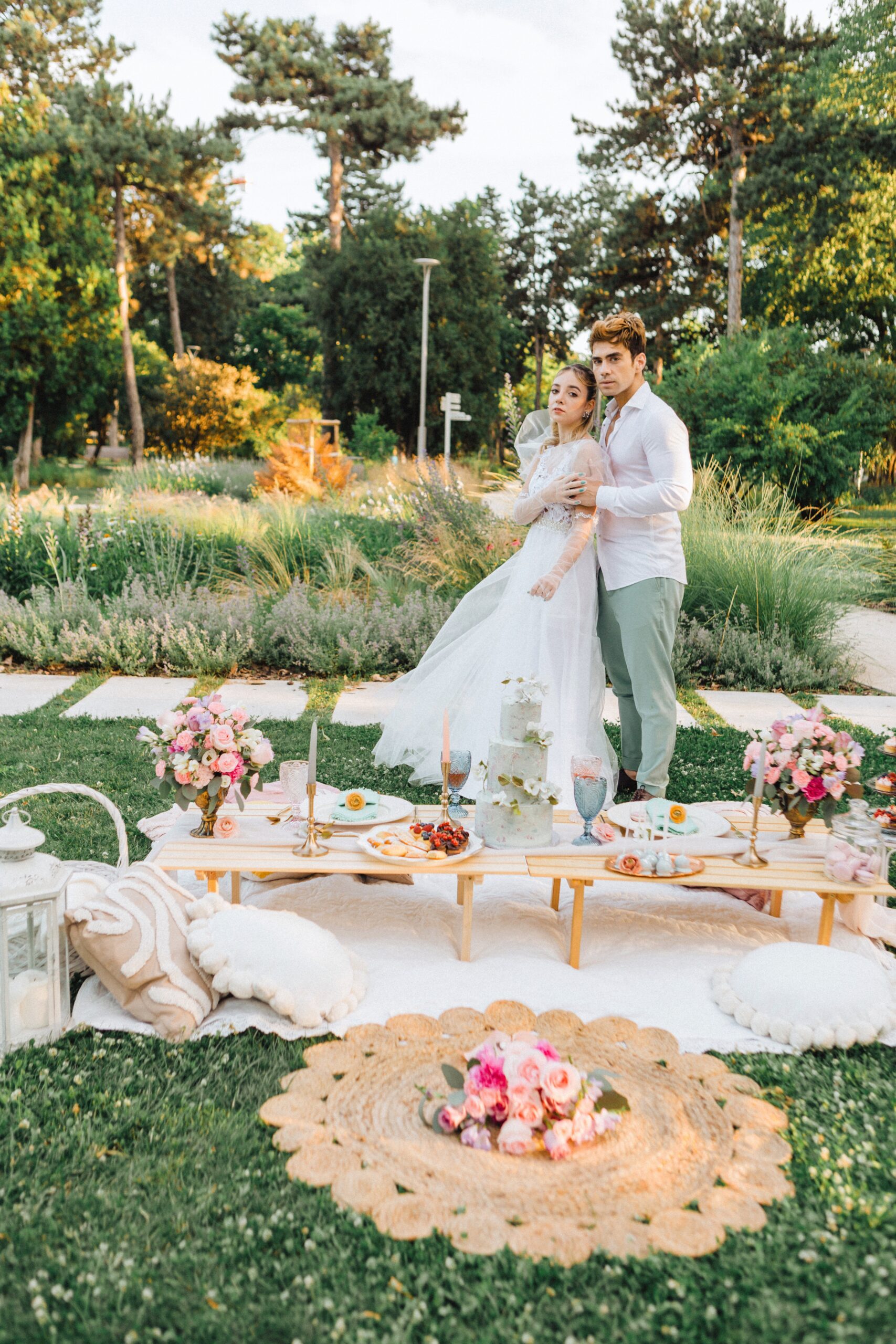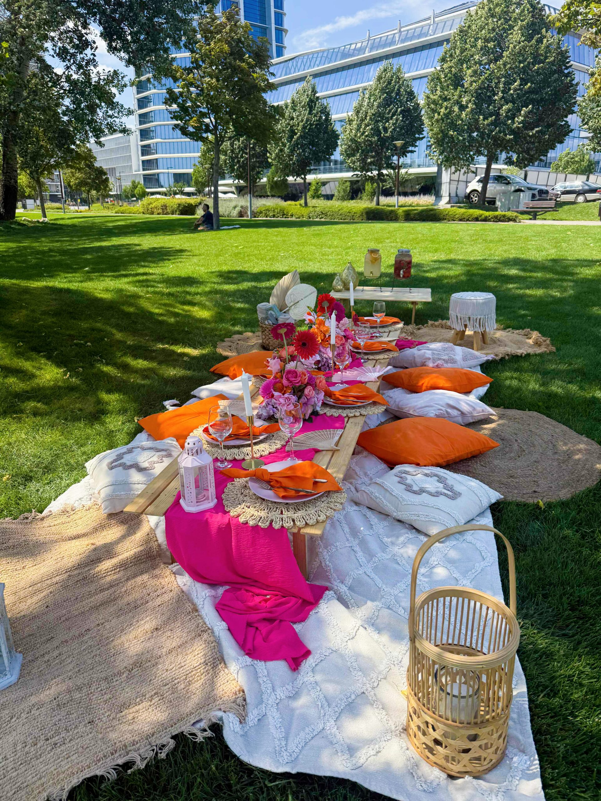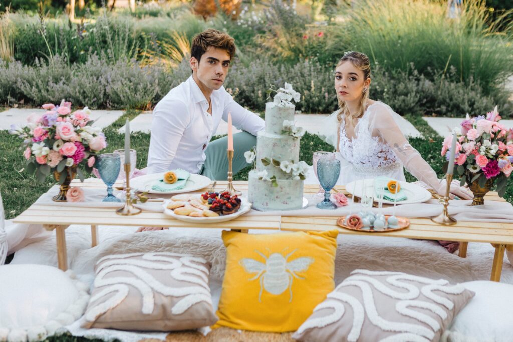 – piknikasztalok teljes terítékkel